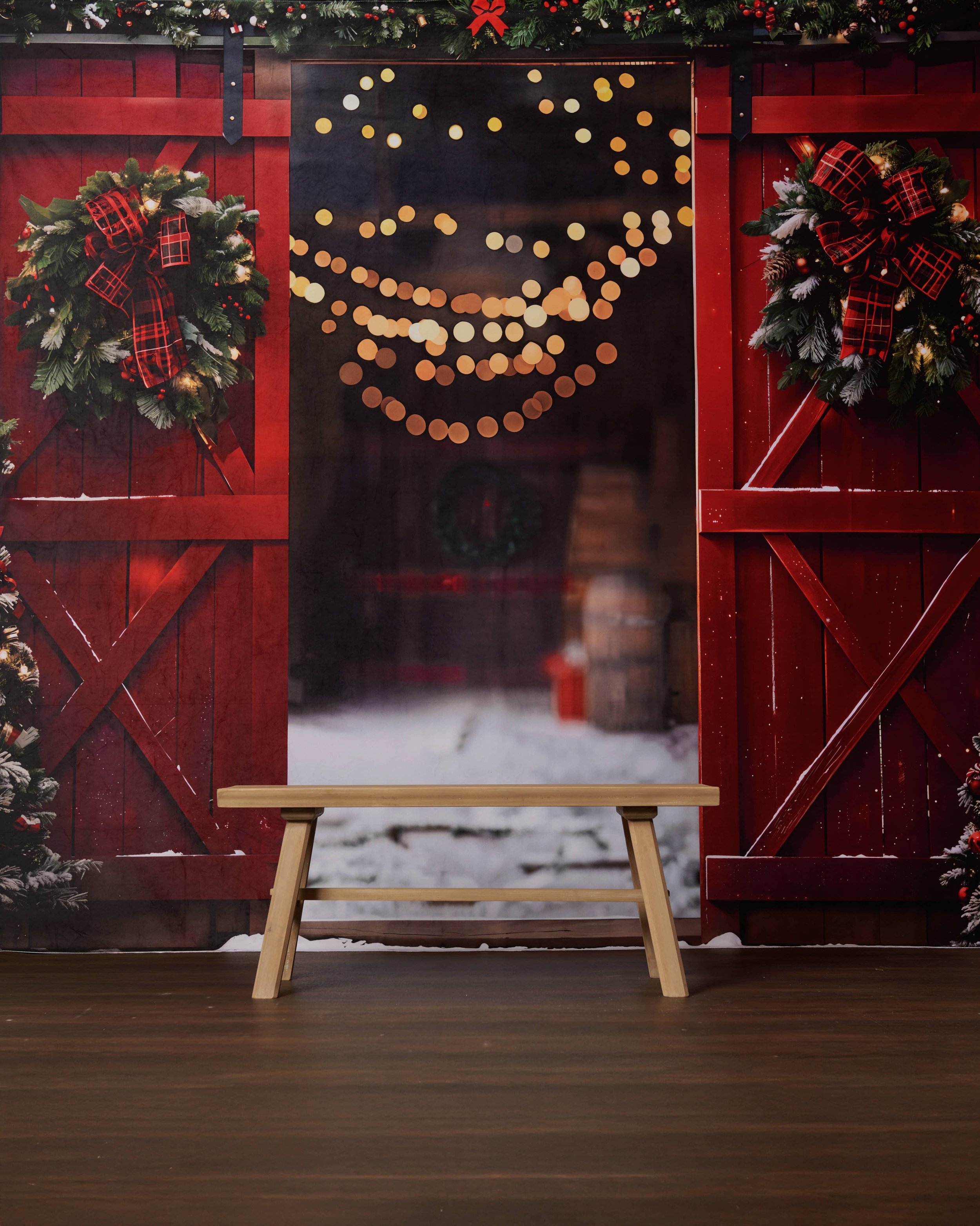 Step into a cozy farmhouse scene with rustic red barn doors, plaid wreaths, and soft string lights. Perfect for families who love a warm, country Christmas feel.